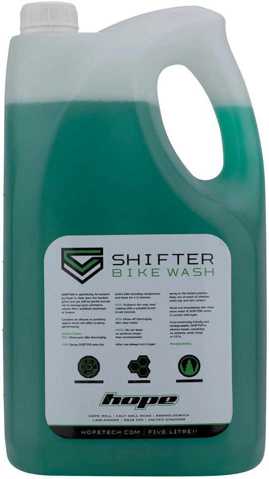 Der Shifter Fahrradreiniger von Hope bekämpft erfolgreich auch hartnäckigen Schmutz, ohne eloxierte Oberflächen oder Scheibenbremsen anzugreifen.
