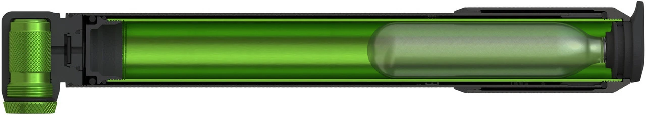 Die 100cc EDC Minipumpe von OneUp Components hat ein Luftvolumen von 100 Kubikzentimetern und pumpt MTB-Reifen mit Presta-Ventil auf bis zu 3,5 bar auf. Zugleich ist sie gute Alternative, wenn Du das EDC Tool oder EDC V2 Tool nicht im Gabelschaft verstauen willst. Im Griff findet sich nämlich ein Hohlraum, in den das Everyday Carry Werkzeugset samt großer und darin integrierter kleiner Aufbewahrungskapsel hineinpasst. Du kannst auch anstelle des Werkzeugsystems oder zusammen mit dem Tool, dann allerdings ohne Kapseln, eine 20 g CO2-Kartusche installieren. Der Pumpen-Kopf am anderen Ende der 100cc lässt sich entfernen, was die Pumpe zum CO2-Inflator macht.