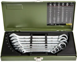 Technische Daten:Material Werkzeug:CrV-StahlMaterial Werkzeugkasten:StahlGrößen:8 / 10 / 13 / 16 / 17 / 18 und 19 mmFunktionen:7Funktionen:Ring-Maulschlüssel:8 / 10 / 13 / 16 / 17 / 18 / 19 mmFeatures:wo herkömmliche Schlüssel nicht mehr umgesetzt werden können, bewährt sich die Ratschen-Funktionabgekapselte Getriebekonstruktionfür Schlüsselweiten extrem geringe Außenmaßesehr schlanker Kopf72-zahniger Innenring aus hochlegiertem SpezialstahlAntrieb erfolgt bereits bei einer Hebelbewegung von 5°übertragbare Drehmomente liegen weit über DIN/ISOSchäfte aus CrV-Stahl mit optimalem Oberflächenschutz (2 x vernickelt, 1 x mattverchromt)deutlich lesbare Schlüsselweiten durch Laser-Markierverfahrenfür zeitsparendes Arbeiten ohne Umsetzenideal zum “ Einstechen“ in enge Räumein extralanger Ausführungstabiler, pulverbeschichteter Stahlkasten7-teiligGrößenberatung:8 mm: