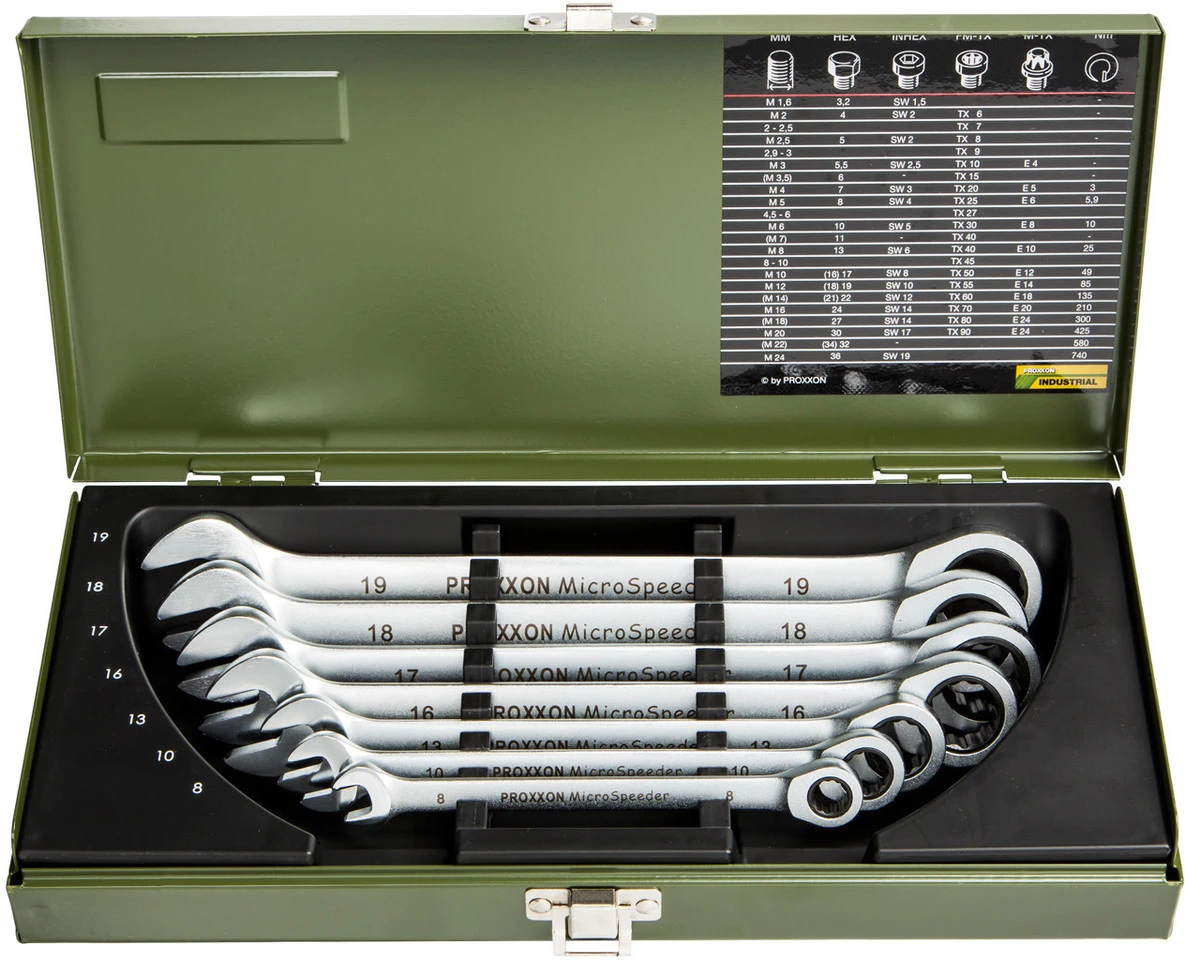Lieferumfang:7 x Ring-Maulschlüssel Proxxon Microspeeder1 x Stahlkasten Proxxon
