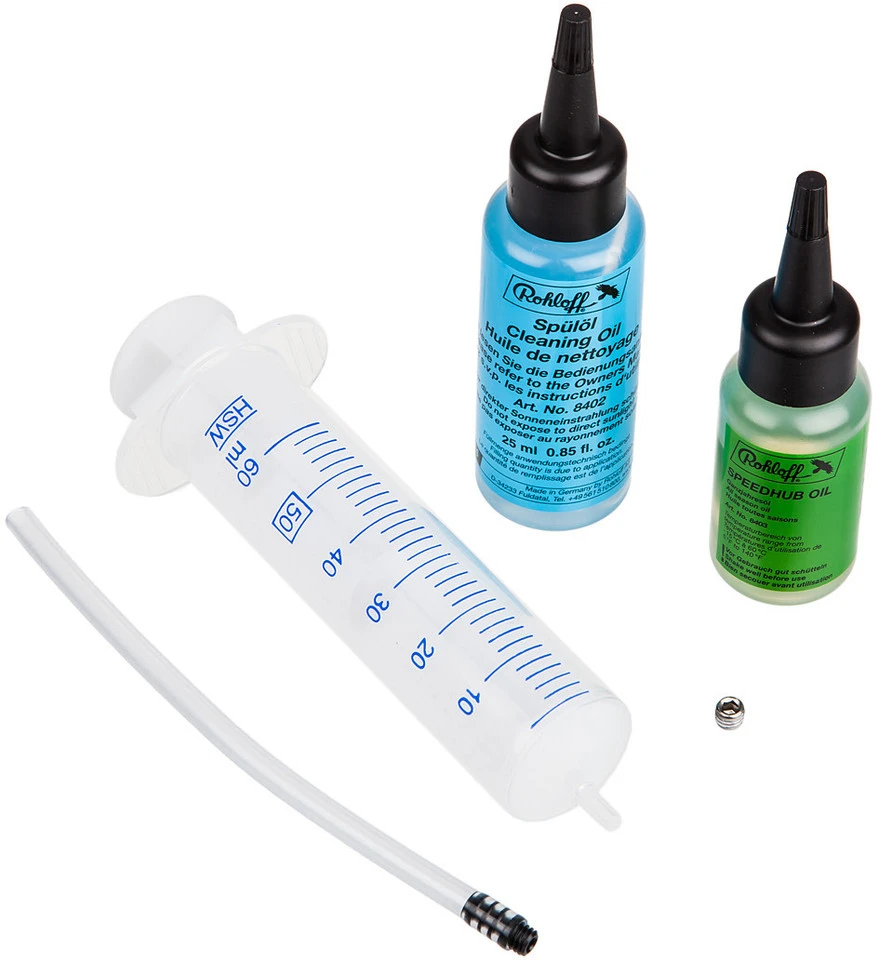 1 x Reinigungsöl Rohloff (25 ml) in 50-ml-Flasche1 x Ganzjahresöl Rohloff (25 ml)1 x Einwegspritze Rohloff1 x Öleinfüllschlauch Rohloff1 x Ölablassschraube Rohloff
